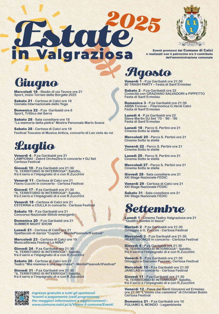 L’amministrazione comunale di Calci ha pubblicato il calendario Estate in Valgraziosa 2025, che elenca gli eventi culturali, sportivi e di intrattenimento che sono patrocinati, sostenuti o direttamente organizzati dal Comune, in programma sul territorio dalla fine di Giugno a quasi tutto Settembre. Attraverso un Qr-Code è inoltre possibile visualizzare con facilità la sezione “Eventi” del sito web del Comune di Calci, dove vengono pubblicate tutte le informazioni aggiornate e dettagliate sugli appuntamenti più imminenti, comprese eventuali aggiunte e/o variazioni.