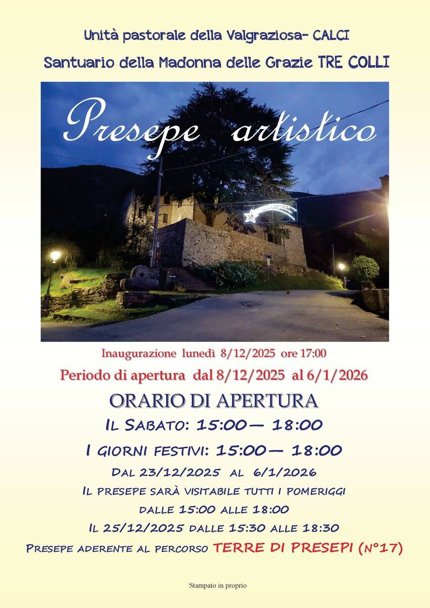 Altrettanto caratteristici gli altri due presepi, inaugurati entrambi l’8 Dicembre. Il Presepe artistico di Tre Colli, realizzato all’interno del Santuario della Madonna delle Grazie dall'Unità Pastorale della Valgraziosa, è opera di alcuni cittadini e alcune cittadine. La tradizionale Natività è ambientata in un paesaggio che richiama la Valgraziosa e le sue storiche tradizioni: le suggestive scenografie esaltano i tratti caratteristici del territorio calcesano, con terrazzamenti di uliveti e macine di pietra durissima estratta dalla roccia della Verruca, e mirano rappresentare le storiche tradizioni calcesane, là dove semplicità e cultura contadina si univano costruendo mulini alimentati da canali d’acqua.