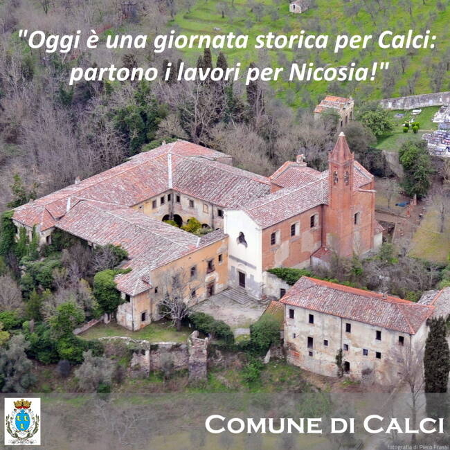 "Oggi è una giornata storica per Calci: partono i lavori per Nicosia! - dichiara il sindaco di Calci, Massimiliano Ghimenti - È stato consegnato pochi giorni fa dalla Soprintendenza alla ditta appaltatrice il cantiere per l'avvio dei tanto attesi lavori al Convento di Sant’Agostino a Nicosia. Esprimo innanzitutto un forte ringraziamento alla Soprintendenza, che ha curato la parte progettuale e gli affidamenti. In questa prima fase, i lavori consisteranno in una pulizia profonda degli spazi esterni, propedeutica alla necessità di controllare le parti più ammalorate e così definire con esattezza il progetto esecutivo. Una volta fatto ciò, partiranno i lavori veri e propri che, in base a quanto previsto, consentiranno innanzitutto di consolidare la struttura (con particolare attenzione a solai, alle coperture e alle parti più deteriorare che rischiamo di perdere) rendendola nuovamente agibile. È di tutta evidenza che questa fase è soltanto la prima, necessaria e non rinviabile, per poi dare il tempo di individuare un percorso per la rifunzionalizzazione e la valorizzazione definitiva del convento. E noi, come amministrazione comunale, non abbiamo mai nascosto che, a nostro giudizio, Nicosia potrebbe essere avviata a divenire una sorta di "Foresteria Nobile", in stretta sinergia con la Certosa.
