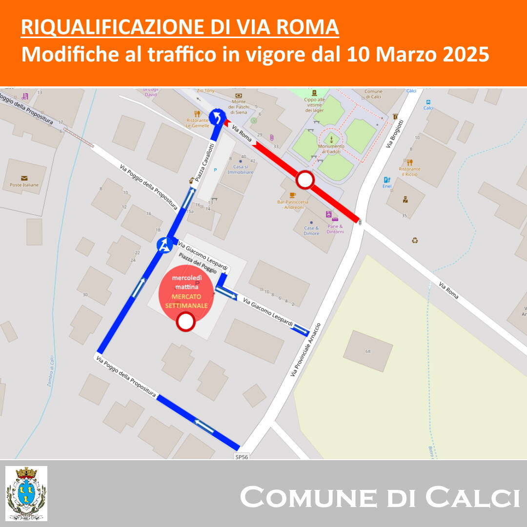 - inversione dell’attuale senso di marcia in via Poggio della Propositura, che sarà dunque percorribile con ingresso dalla Sp24 Arnaccio-Calci e con uscita da piazza Cavallotti, dove sarà in vigore il senso unico per l’immissione in via Roma;