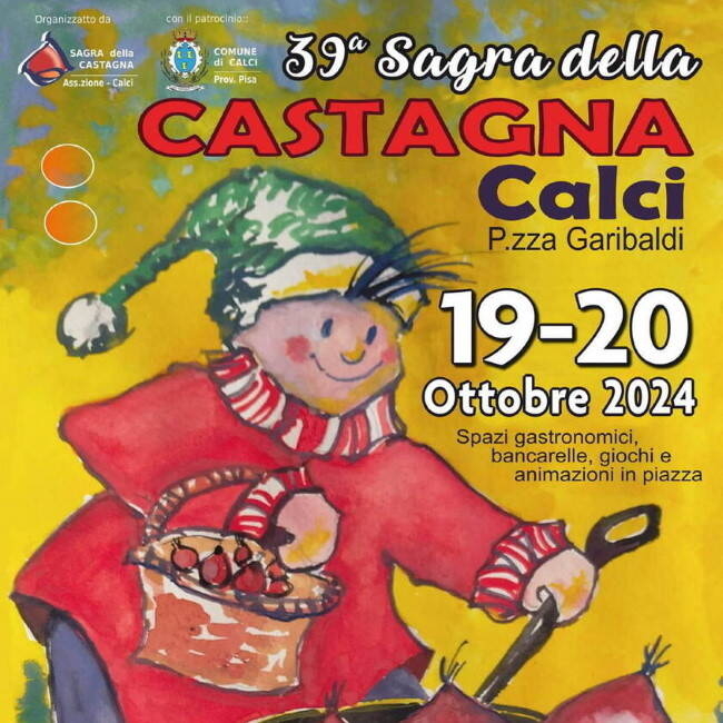 Sabato 19 e domenica 20 Ottobre 2024 torna la Sagra della Castagna di Calci, giunta alla 39esima edizione, grazie all’impegno dell’omonimo comitato e al sostegno dell’amministrazione comunale. Gli spazi gastornomici saranno allestiti come di consueto nel Parco Sandro Pertini, a fianco del palazzo comunale, dove sarà possibile gustare le frittelle dolci, i necci con la ricotta, il castagnaccio, le castagne arrostite e i tipici “bartalucci” (pasta fritta), serviti soli o farciti con salsiccia o crema di nocciole.