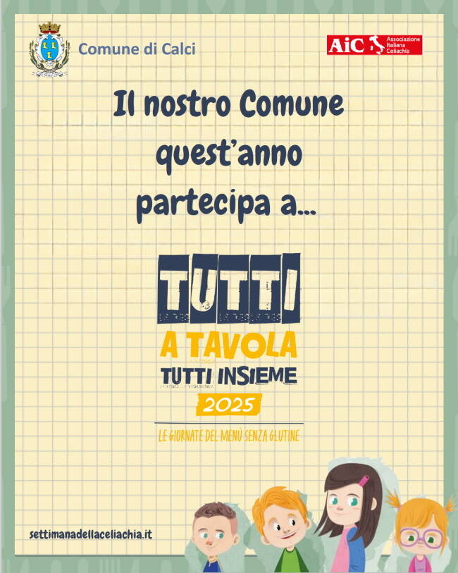 L’amministrazione comunale di Calci ha aderito a Tutti a tavola tutti insieme 2025, giornata del menù senza glutine promossa dall’Associazione Italiana Celiachia in occasione della 11esima Settimana Nazionale della Celiachia. Grazie alla disponibilità di Cirfood, gli alunni e le alunne della scuola dell'infanzia e della scuola primaria di Calci hanno oggi condiviso un pasto senza glutine, accompagnato da schede-gioco informative e gadget. Il Comune di Calci ha così voluto promuovere, anche attraverso materiale divulgativo creato ad hoc da AIC e messo a disposizione delle insegnanti e delle famiglie, una corretta conoscenza della celiachia e della dieta senza glutine.
