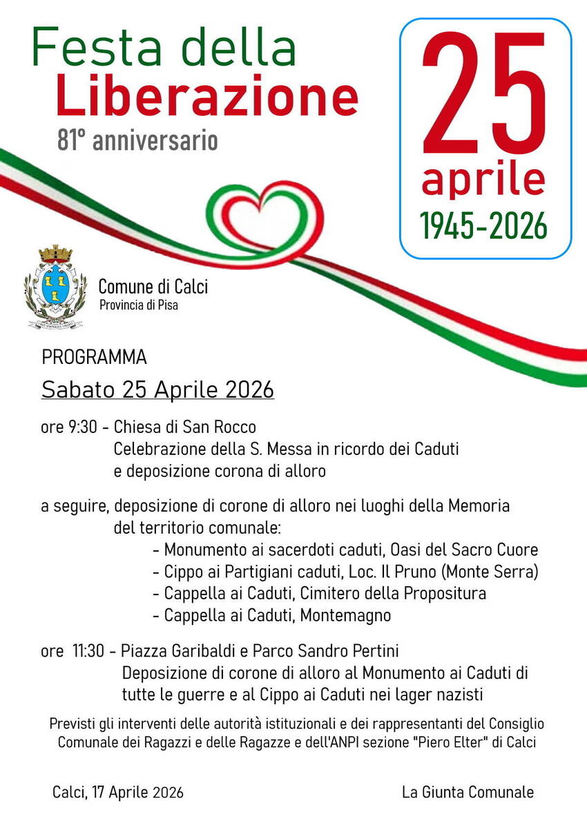 Previsti gli interventi delle autorità istituzionali e dei rappresentanti del Consiglio Comunale dei Ragazzi e delle Ragazze e dell'ANPI sezione "Piero Elter" di Calci.
