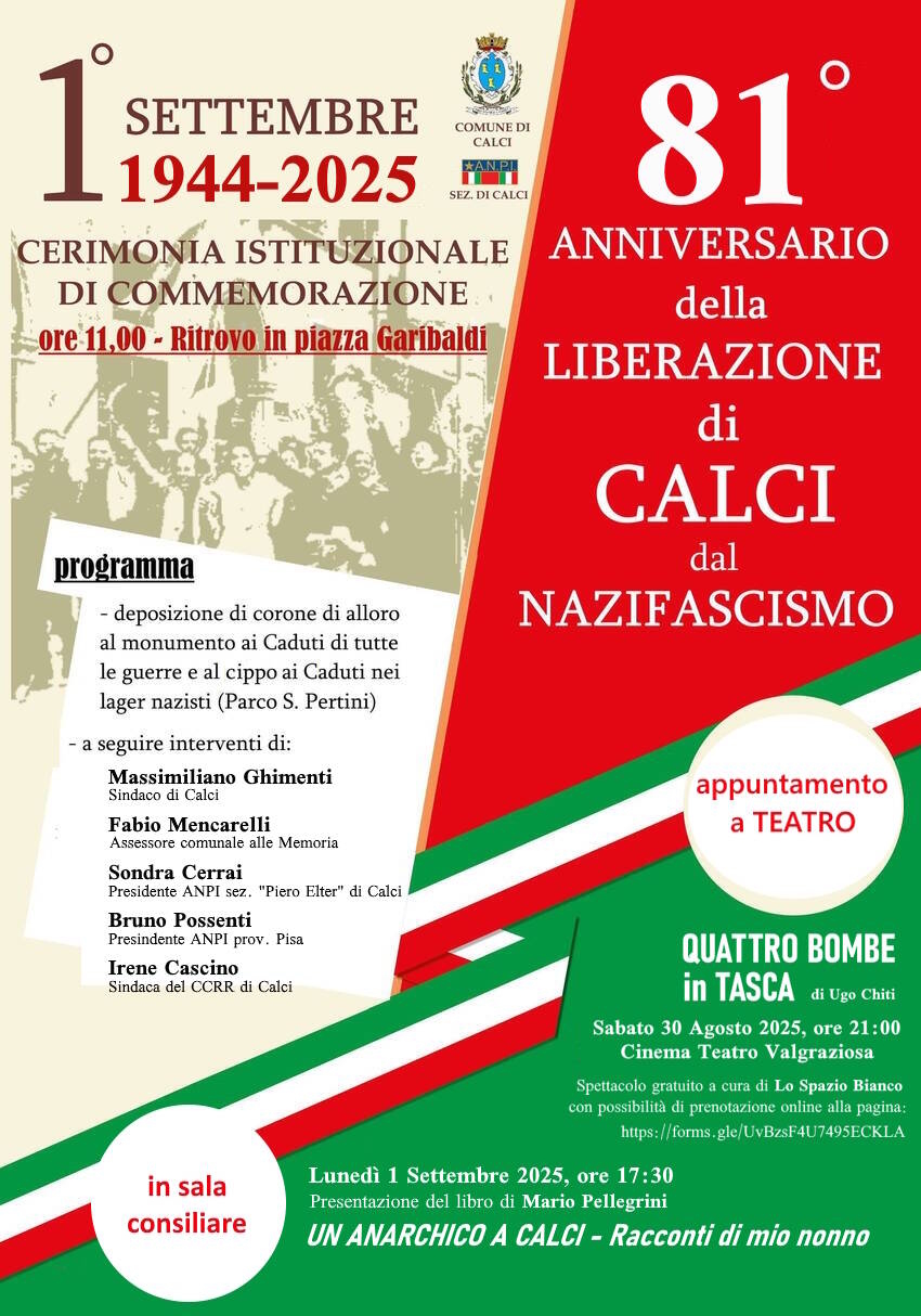 Il 1 Settembre 1944 le truppe alleate oltrepassarono l'Arno, determinando la Liberazione di Calci dal nazifascimo. Nell'81° anniversario di quell'evento, lunedì 1 Settembre 2025, l'amministrazione di Calci ha previsto una cerimonia istituzionale di commemorazione che si svolgerà la mattina, a partire dalle ore 11. Due gli eventi collaterali: alle ore 21 di sabato 30 Agosto, al Cinema Teatro Valgraziosa, andrà in scena lo spettacolo Quattro bombe in tasca di Ugo Chiti, una produzione Lo Spazio Bianco; alle 17,30 di lunedì 1 Settembre, in sala consiliare, sarà presentato il libro Un anarchico a Calci - Racconti di mio nonno di Mario Pellegrini.