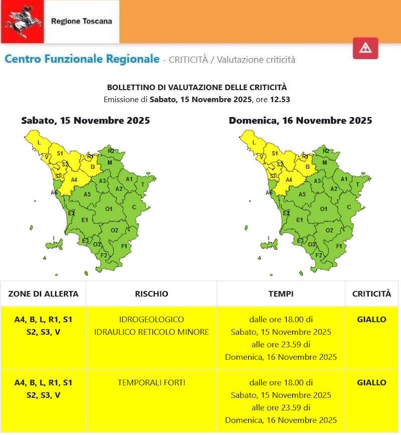 - CODICE GIALLO per rischio TEMPORALI FORTI e RISCHIO IDROGEOLOGICO e IDRAULICO del reticolo minore valido dalle ore 18:00 di oggi, sabato 15 Novembre 2025, alle ore 23:59 di domani, domenica 16 Novembre 2025.
