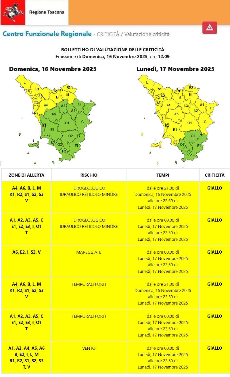 - CODICE GIALLO per rischio TEMPORALI FORTI e RISCHIO IDROGEOLOGICO e IDRAULICO del reticolo minore valido dalle ore 21:00 di oggi, domenica 16 Novembre 2025, alle ore 23:59 di domani, lunedì 17 Novembre 2025.