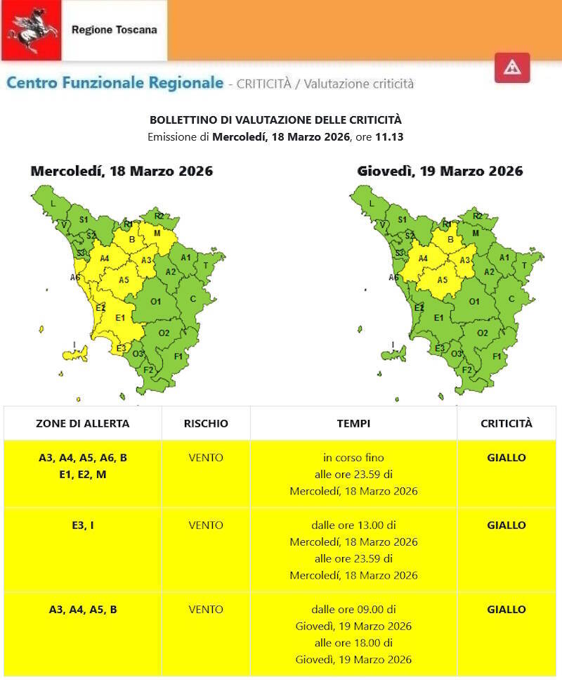 - CODICE GIALLO per rischio VENTO FORTE in corso valido fino alle ore 23:59 di oggi, mercoledì 18 Marzo 2026;
