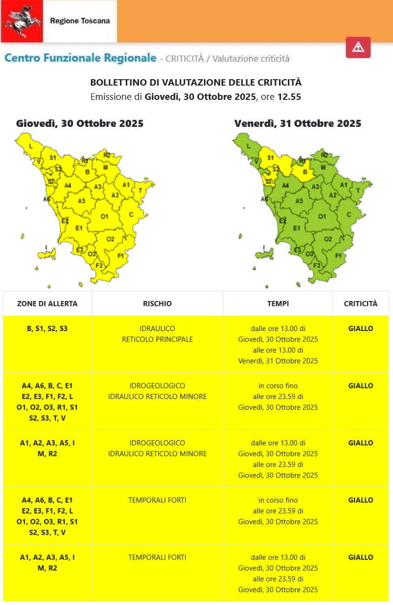 - CODICE GIALLO per rischio FORTI TEMPORALI e RISCHIO IDROGEOLOGICO e IDRAULICO del reticolo minore in corso, valido fino alle ore 23:59 di oggi, giovedì 30 Ottobre 2025.