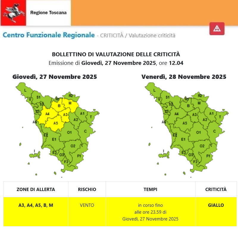 - confermato il CODICE GIALLO per rischio FORTE VENTO in corso, valido fino alle ore 23:59 di oggi, giovedì 27 Novembre 2025.