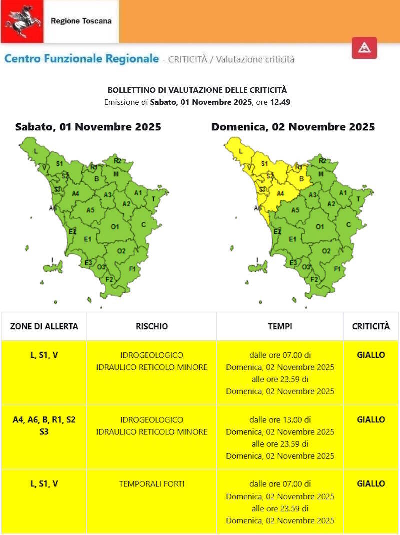 - CODICE GIALLO per RISCHIO IDROGEOLOGICO e IDRAULICO del reticolo minore valido domani, domenica 2 Novembre 2025, dalle ore 13 alle ore 23,59.