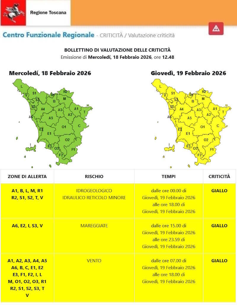 - CODICE GIALLO per rischio VENTO FORTE valido domani, giovedì 19 Febbraio 2026, dalle ore 07:00 alle ore 18:00.