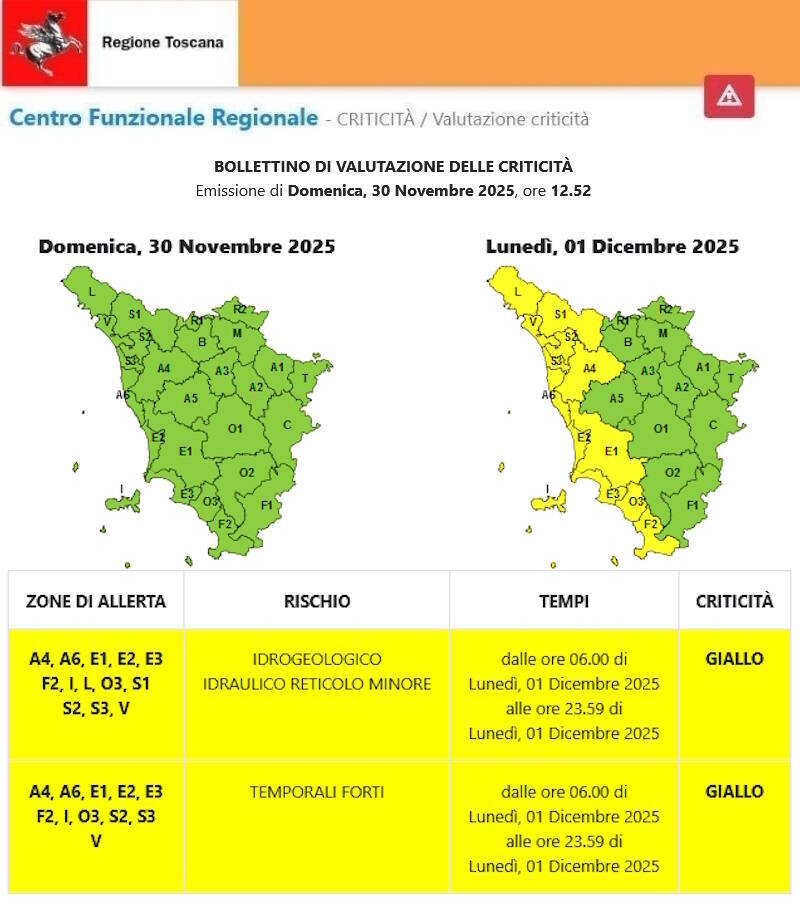 - CODICE GIALLO per rischio TEMPORALI FORTI e RISCHIO IDROGEOLOGICO E IDRAULICO del reticolo minore valido domani, lunedì 1 Dicembre 2025, dalle ore 6:00 alle ore 23:59.