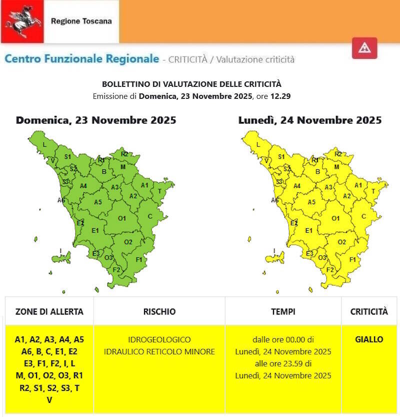 - CODICE GIALLO per RISCHIO IDROGEOLOGICO E IDRAULICO del reticolo minore valido per l'intera giornata (24h) di domani, lunedì 24 Novembre 2025.