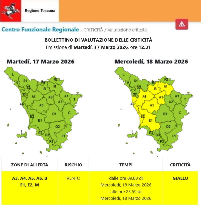 - CODICE GIALLO per rischio VENTO FORTE in corso valido domani, mercoledì 18 Marzo 2026, dalle ore 9:00 alle ore 23:59.