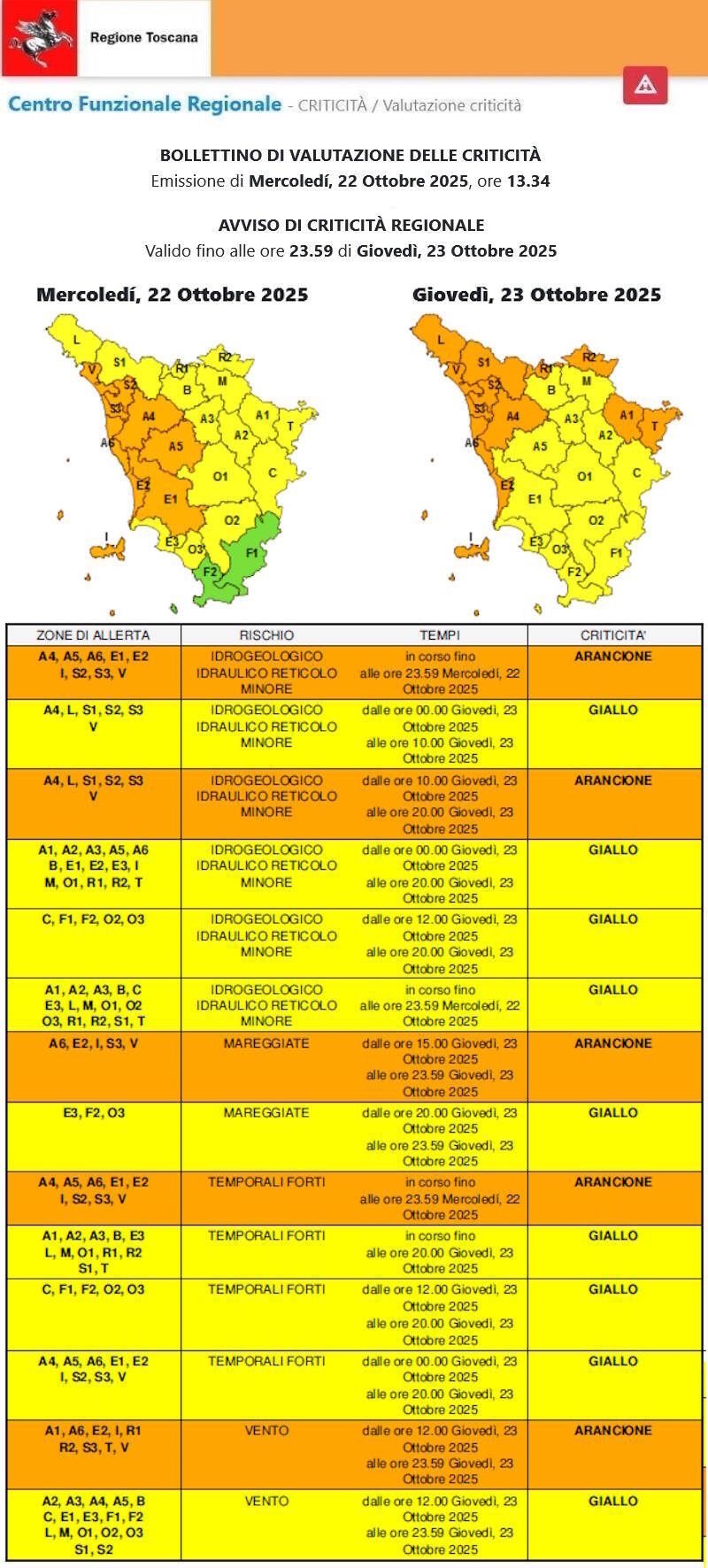 - CODICE ARANCIONE per rischio FORTI TEMPORALI e rischio IDROGEOLOGICO e IDRAULICO del reticolo minore in corso, valido fino alle ore 23,59 di oggi, mercoledì 22 Ottobre 2025;