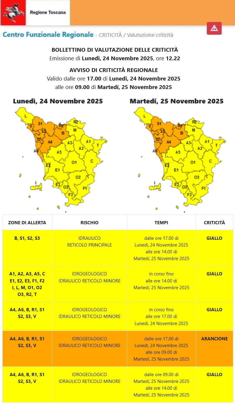 - CODICE ARANCIONE per rischio IDROGEOLOGICO e IDRAULICO del reticolo minore, valido dalle ore 17:00 di oggi, lunedì 24 Novembre 2025, alle ore 9:00 di domani, martedì 25 Novembre 2025;