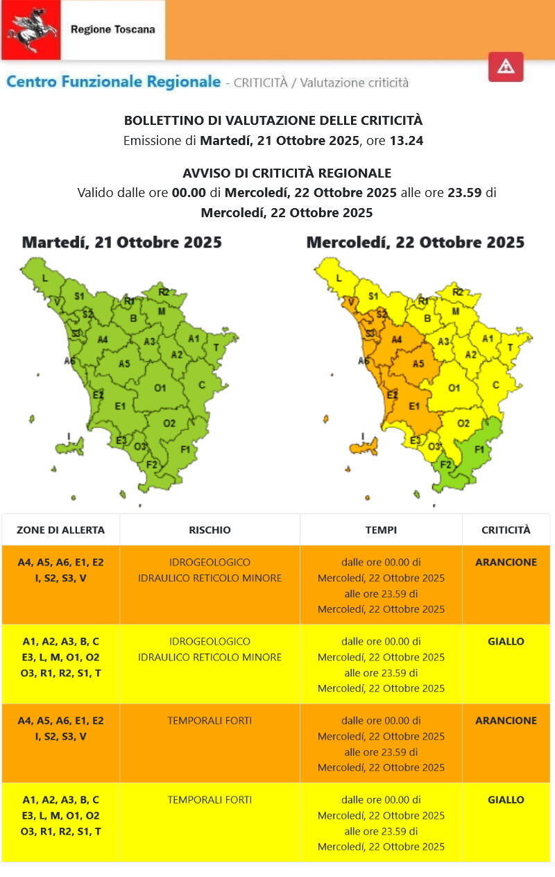 - CODICE ARANCIONE per rischio FORTI TEMPORALI e rischio IDROGEOLOGICO e IDRAULICO del reticolo minore valido per l'intera giornata (24h) di domani, mercoledì 22 Ottobre 2025.