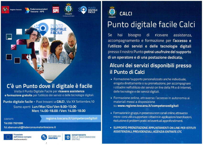 Nella sede della Spi-Cgil di Calci, in via XX Settembre 10, è stato attivato un Punto Digitale Facile, al quale cittadini e cittadine possono rivolgersi per ricevere assistenza e formazione gratuita per l’utilizzo dei servizi e delle tecnologie digitali.