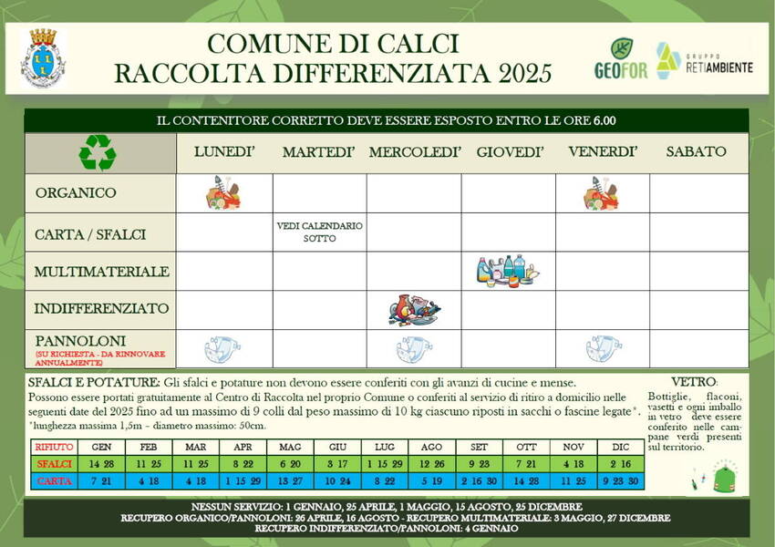 Si invitano i cittadini a prendere visione e a rispettare il Calendario 2025 per la raccolta porta a porta dei rifiuti. Il calendario, le variazioni annuali e altre informazioni utili sono qui disponibili anche in formato .pdf per essere scaricate e conservate.
