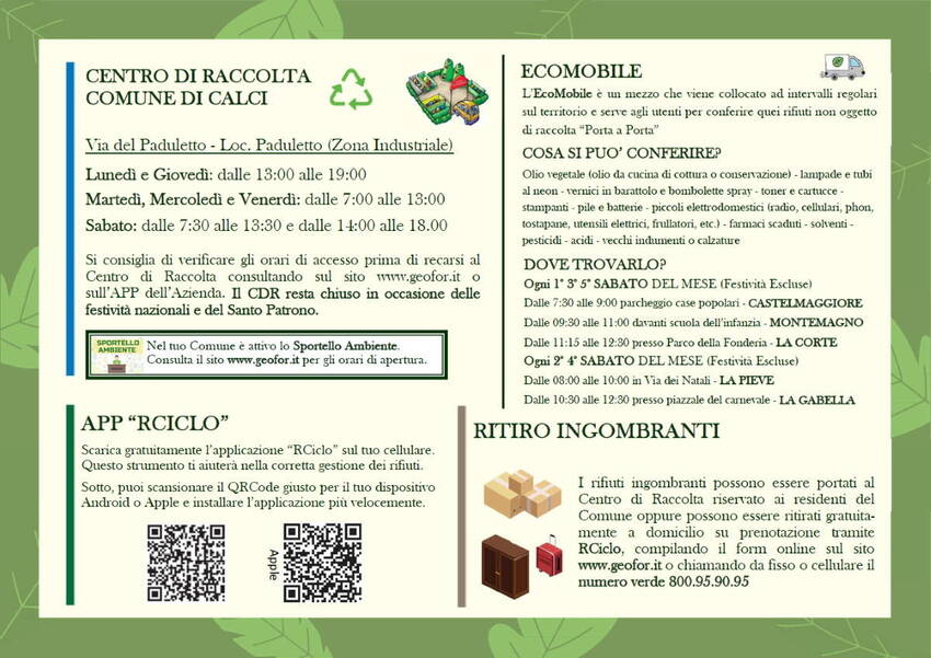 Lo SPORTELLO AMBIENTE di Geofor, attivo nei locali della biblioteca comunale “Leopoldo Meucci” (via Vincente della Chiostra 49, Calci), è aperto al pubblico tutti i mercoledì dalle 8,30 alle 12,30.