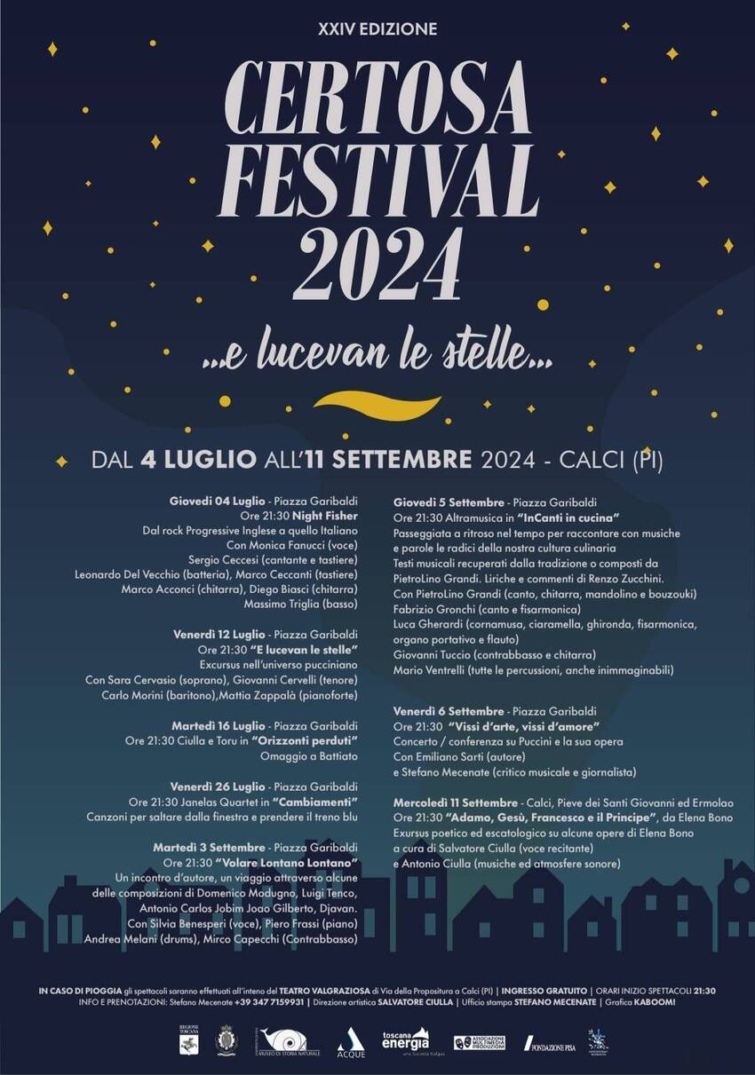 Il Certosa Festival, la cui direzione artistica è affidata a Salvatore Ciulla, è realizzato grazie al contributo del Comune di Calci, della Fondazione Pisa e della Presidenza del Consiglio della Regione Toscana, nonché grazie al sostegno e la collaborazione di associazioni, enti e sponsor.