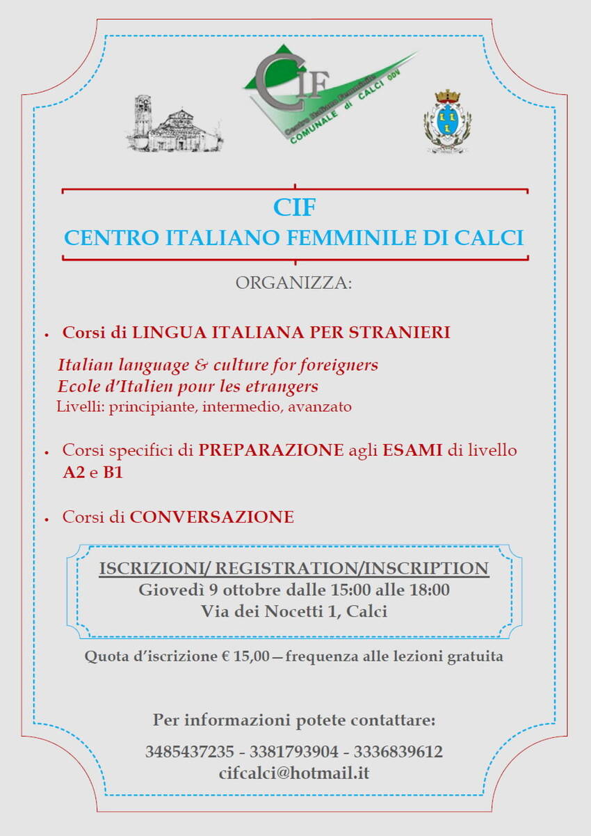 Anche per l'anno educativo 2025/2026 il Cif comunale di Calci, con il patrocinio dell'amministrazione comunale, organizza corsi gratuiti di: