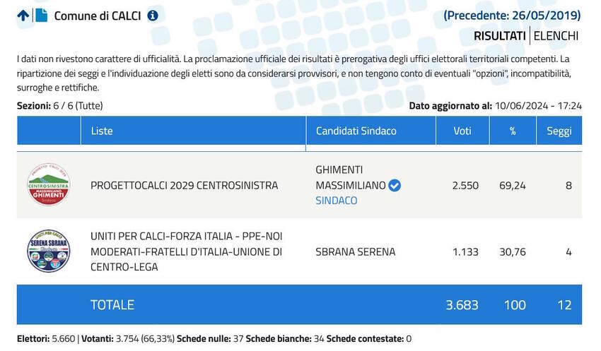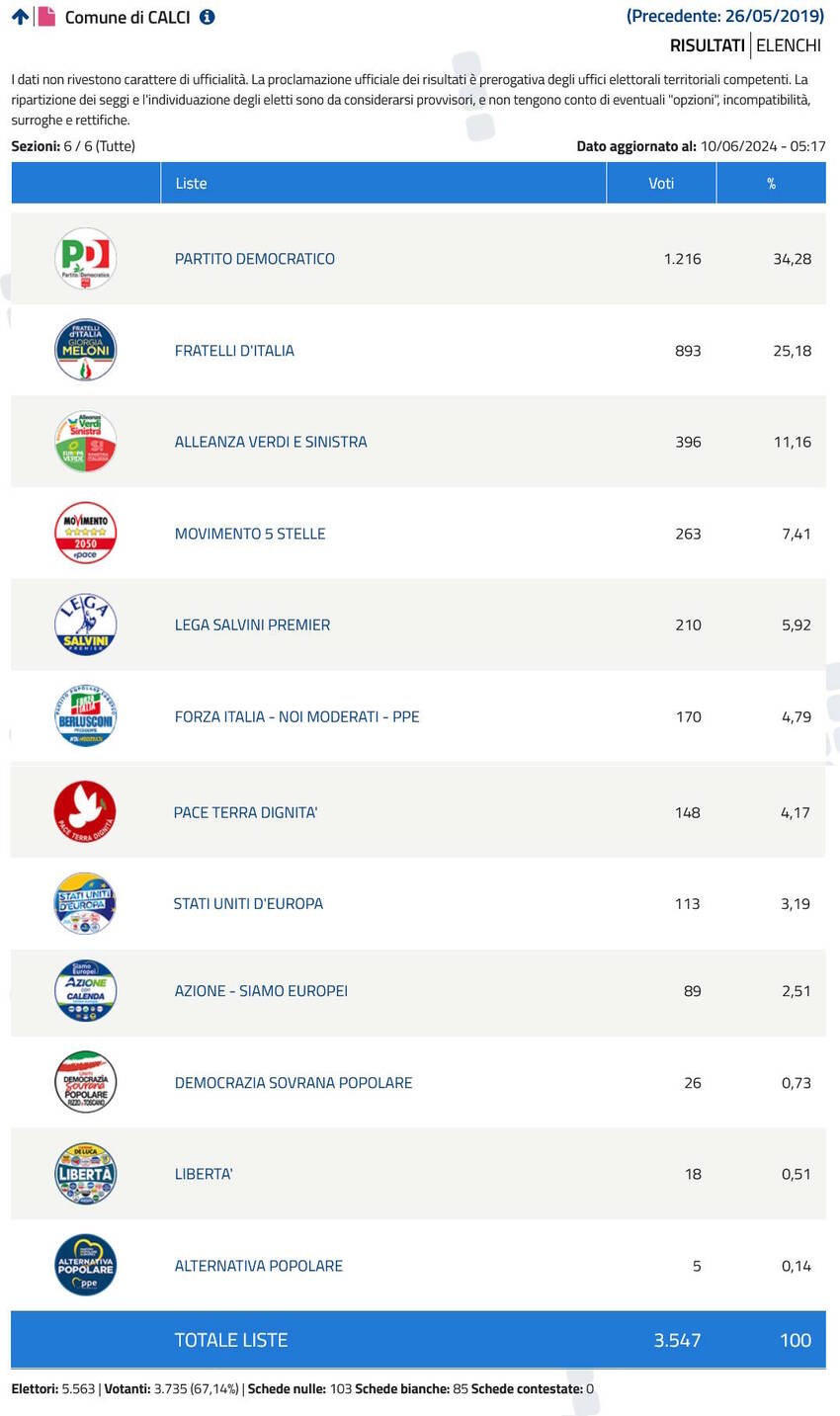 I dati su preferenze e risultati nelle singole sezioni sono disponibili su ELIGENDO - Scrutinio elezioni europee 2024 CALCI