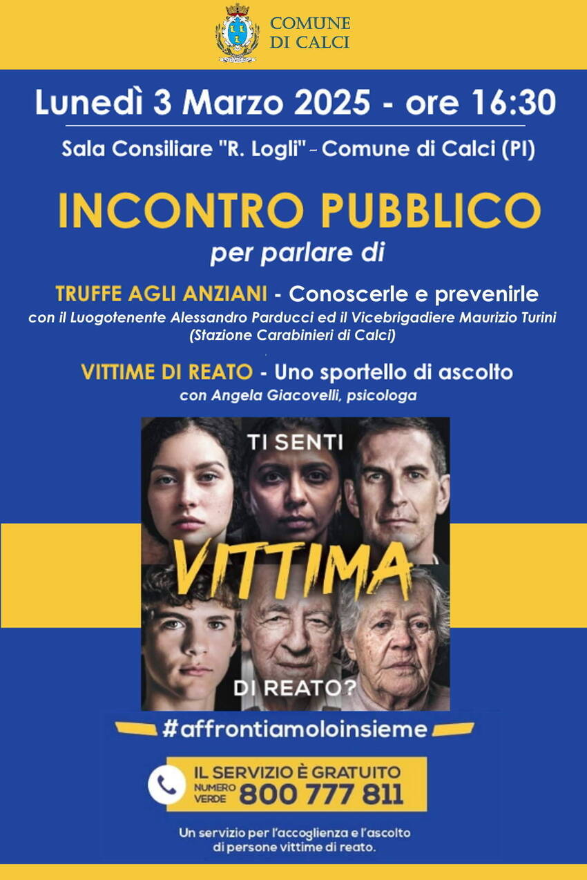 L'amministrazione comunale di Calci promuove un incontro pubblico per parlare di truffe agli anziani e dello Sportello di ascolto rivolto alle vittime di reato.