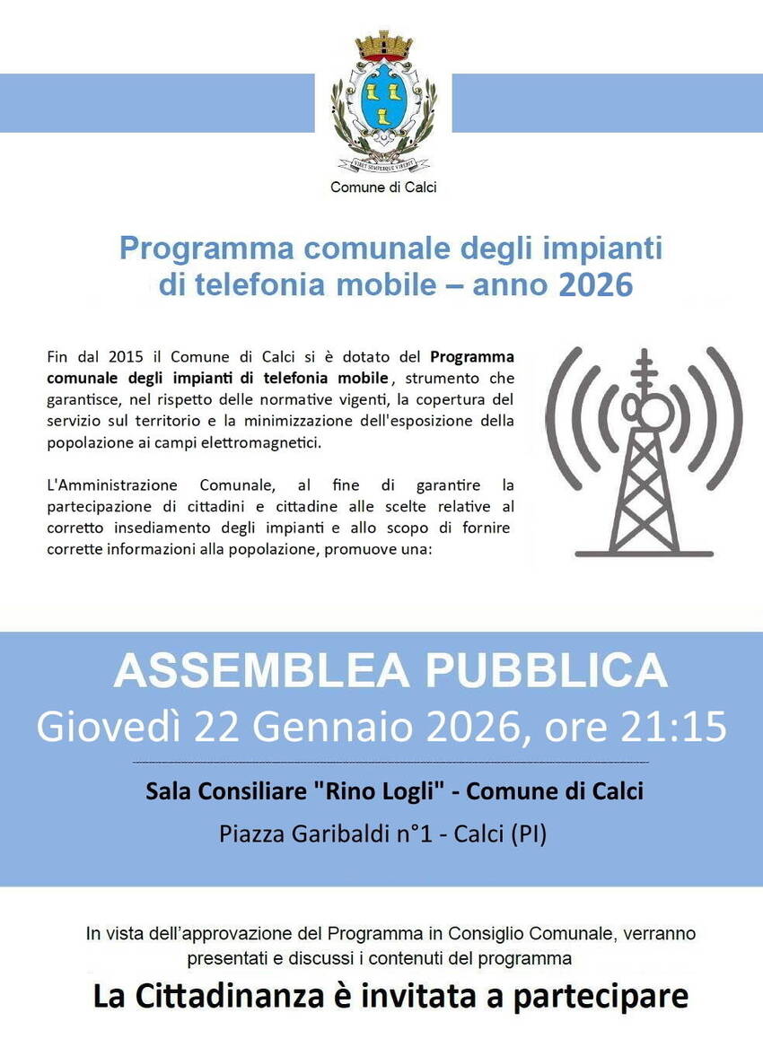 Il Programma comunale degli impianti di telefonia mobile per l’anno 2026 sarà al centro di una assemblea pubblica, che si terrà in sala consiliare alle ore 21:15 di giovedı̀ 22 Gennaio 2026.