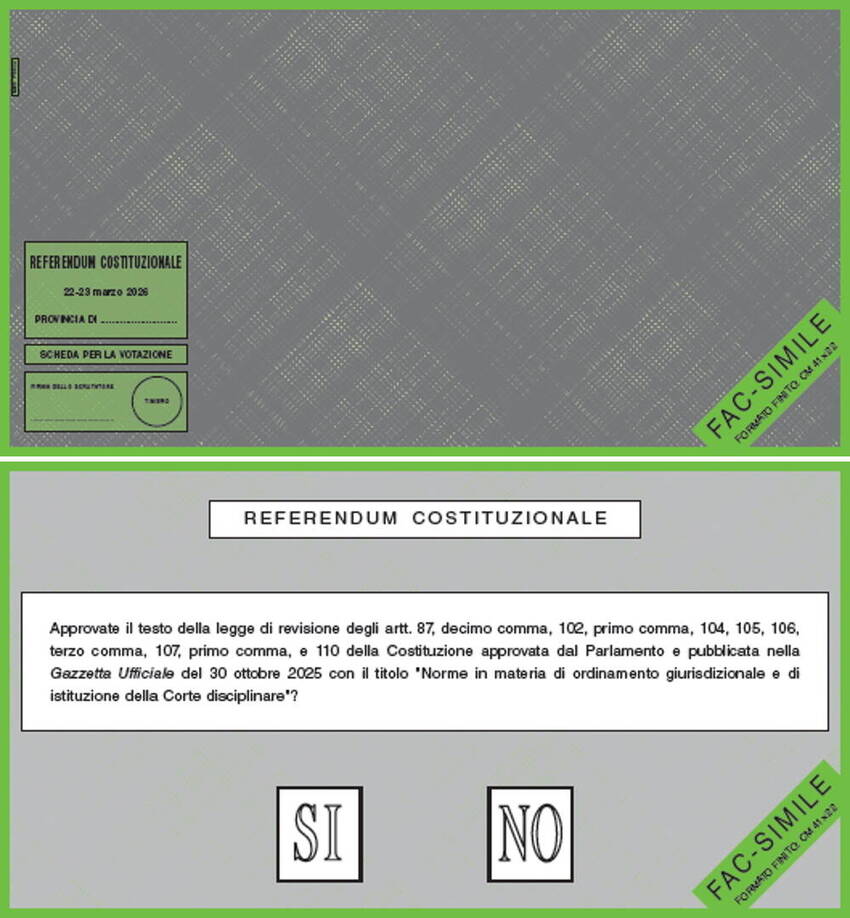 «Approvate il testo della legge di revisione degli artt. 87, decimo comma, 102, primo comma, 104, 105, 106, terzo comma, 107, primo comma, e 110 della Costituzione approvata dal Parlamento e pubblicata nella Gazzetta Ufficiale del 30 ottobre 2025 con il titolo “Norme in materia di ordinamento giurisdizionale e di istituzione della Corte disciplinare”?».