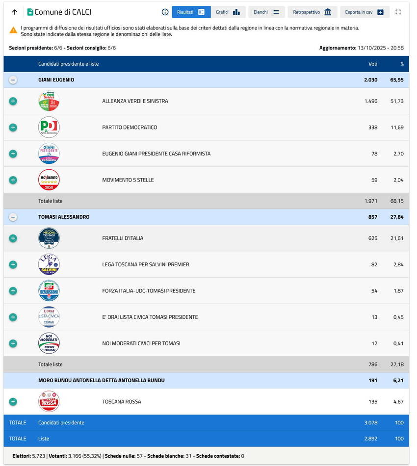 Domenica 12 e lunedì 13 Ottobre 2025 si sono svolte le consultazioni per l'elezione del Presidente della Giunta regionale e del Consiglio regionale della Toscana. Di seguito l'esito per il Comune di Calci.