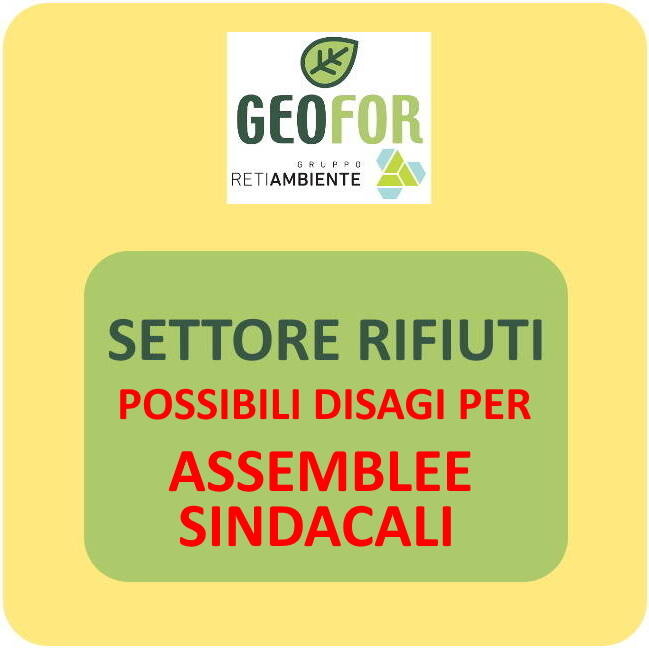 Geofor Spa, che svolge il servizio di raccolta dei rifiuti nel Comune di Calci, comunica che le Organizzazioni Sindacali di Geofor (FP-CGIL, FIT-CISL, UIL Trasporti e Fiadel), in conformità a quanto previsto dal vigente Contratto Collettivo Nazionale di Lavoro (CCNL), hanno indetto delle assemblee sindacali rivolte a tutto il personale in servizio.