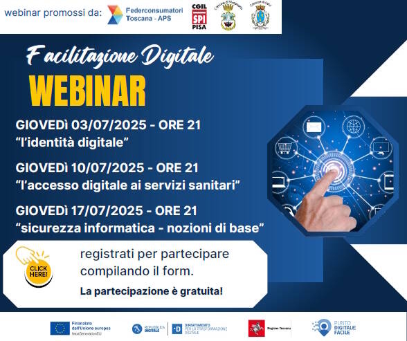 Continua il ciclo di webinar dedicati alla conoscenza dei servizi digitali promossi da Federconsumatori Toscana, da SPI Cgil Pisa e dai Comuni di Calci e Vicopisano, nell’ambito della “rete di servizi di facilitazione digitale” del PNRR. Questi i prossimi appuntamenti;