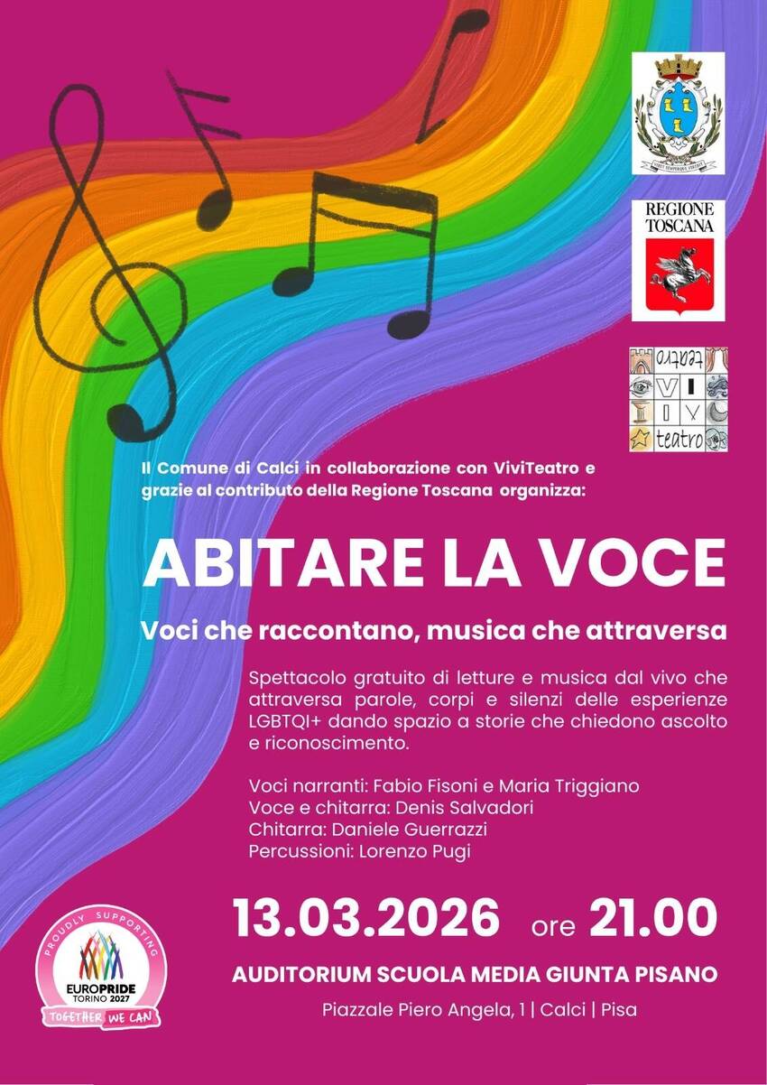 Alle ore 21:00 di venerdì 13 Marzo 2026, nell'auditorium della scuola media Giunta Pisano, Abitare la voce. Voci che raccontano, musica che attraversa, uno spettacolo gratuito di letture e musica dal vivo che attraversa parole, corpi e silenzi delle esperienze LGBTQI+ dando spazio a storie che chiedono ascolto e riconoscimento.