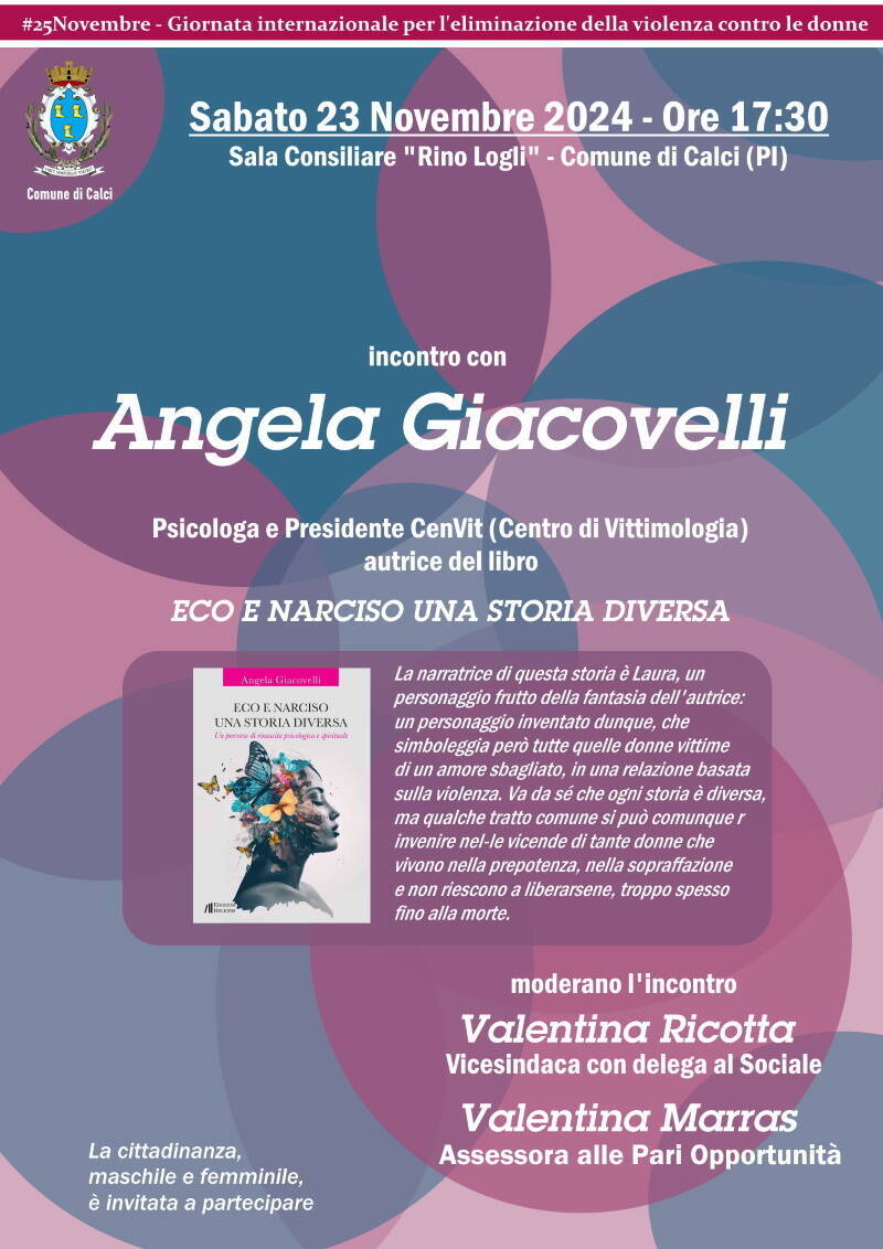 L'amministrazione comunale di Calci, nell'ambito delle iniziative per la Giornata internazionale per l'eliminazione della violenza contro le donne (25 Novembre), invita cittadini e cittadine all'incontro con Angela Giacovelli, presidente CenVit e autrice del libro Eco e Narciso una storia diversa, che si terrà alle 17,30 di sabato 23 Novembre 2024 in sala consiliare "Rino Logli" (Comune di Calci).