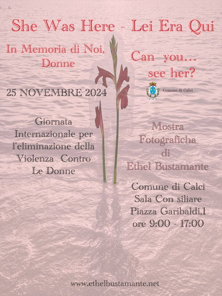 L'amministrazione comunale di Calci, nell'ambito delle iniziative per la Giornata internazionale per l'eliminazione della violenza contro le donne, invita cittadini e cittadine alla mostra fotografica She was here. Lei era qui di Ethel Bustamante, che si terrà lunedì 25 Novembre 2024 in sala consiliare "Rino Logli" (Comune di Calci), dalle ore 9 alle ore 17.