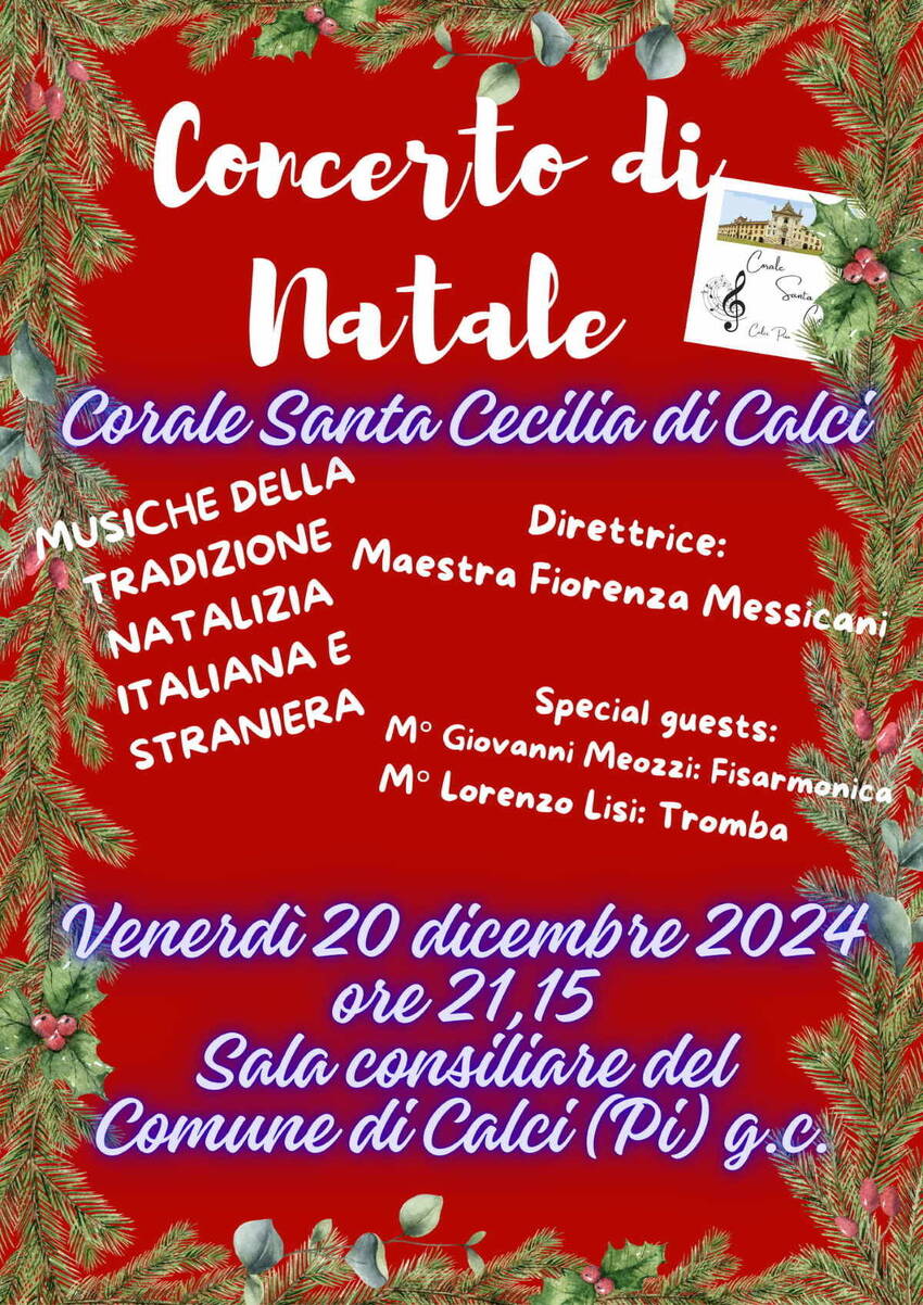 Alle ore 21,15 di venerdì 20 Dicembre 2024, in sala consiliare Rino Logli (Comune di Calci), il tradizionale Concerto di Natale della Corale Santa Cecilia di Calci, con musiche della tradizione natalizia italiana e straniera. Dirige la Maestra Fiorenza Messicani. Ospiti d'eccezione il Maestro Giovanni Meozzi (fisarmonica) e il Maestro Lorenzo Lisi (tromba).