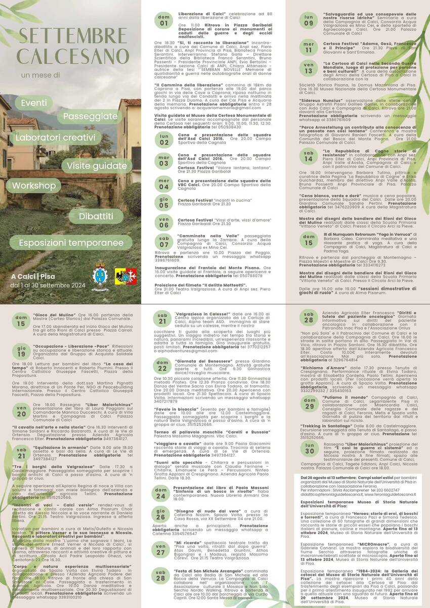 Ore 18.30 “Sì, ti racconto la liberazione” incontro-dibattito a cura del Comune di Calci, Anpi sez. Piero Elter di Calci, Anpi Provincia di Pisa, Biblioteca Franco Serantini. Interverranno: Stefano Gallo – Direttore Scientifico della Biblioteca Franco Serantini, Bruno Possenti – Presidente Provinciale ANPI, Evio Bertolini – Presidente sezione Calci di ANPI, Chiara Attanasio - autrice della tesi “"SEMBRAN NOVELLE" Memorie di quotidianità e guerra nelle autobiografie orali di donne calcesane”